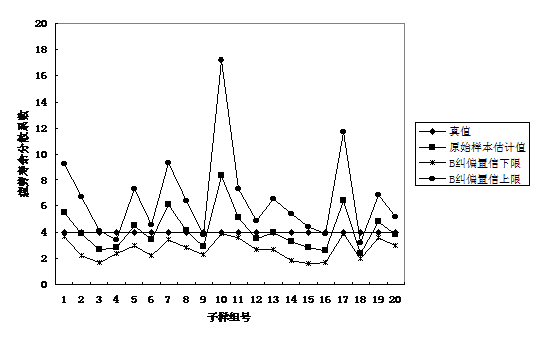 圖9.3 各種不同方法計(jì)算的20組容量為15的子樣的疲勞分散系數(shù)